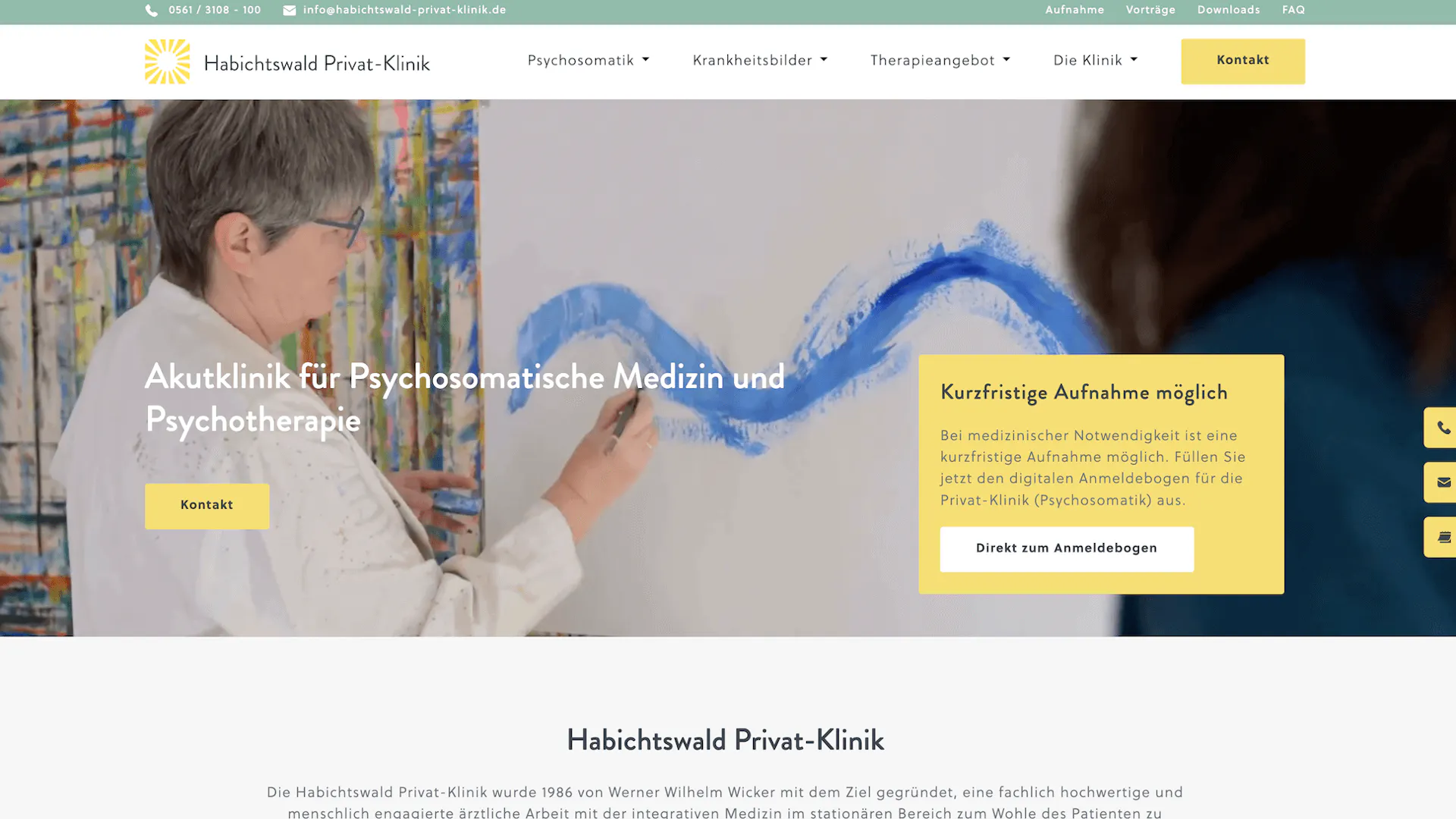 Mitten im Grünen, am UNESCO-Bergpark Wilhelmshöhe in Kassel, steht die Habichtswald Privat-Klinik für spezialisierte Psychosomatik auf höchstem Niveau. Genau diesen Anspruch sollte auch der digitale Auftritt widerspiegeln: Vertrauen, fachliche Kompetenz und eine Atmosphäre, die Sicherheit und Ruhe vermittelt. Dafür haben wir die Präsenz ganzheitlich neu gedacht – von der strategisch aufgebauten Website über suchmaschinenoptimierte Inhalte bis hin zu einer aktiven Social-Media-Kommunikation. Hochwertige Bilder und professionelle Videoaufnahmen unterstreichen die Qualität.