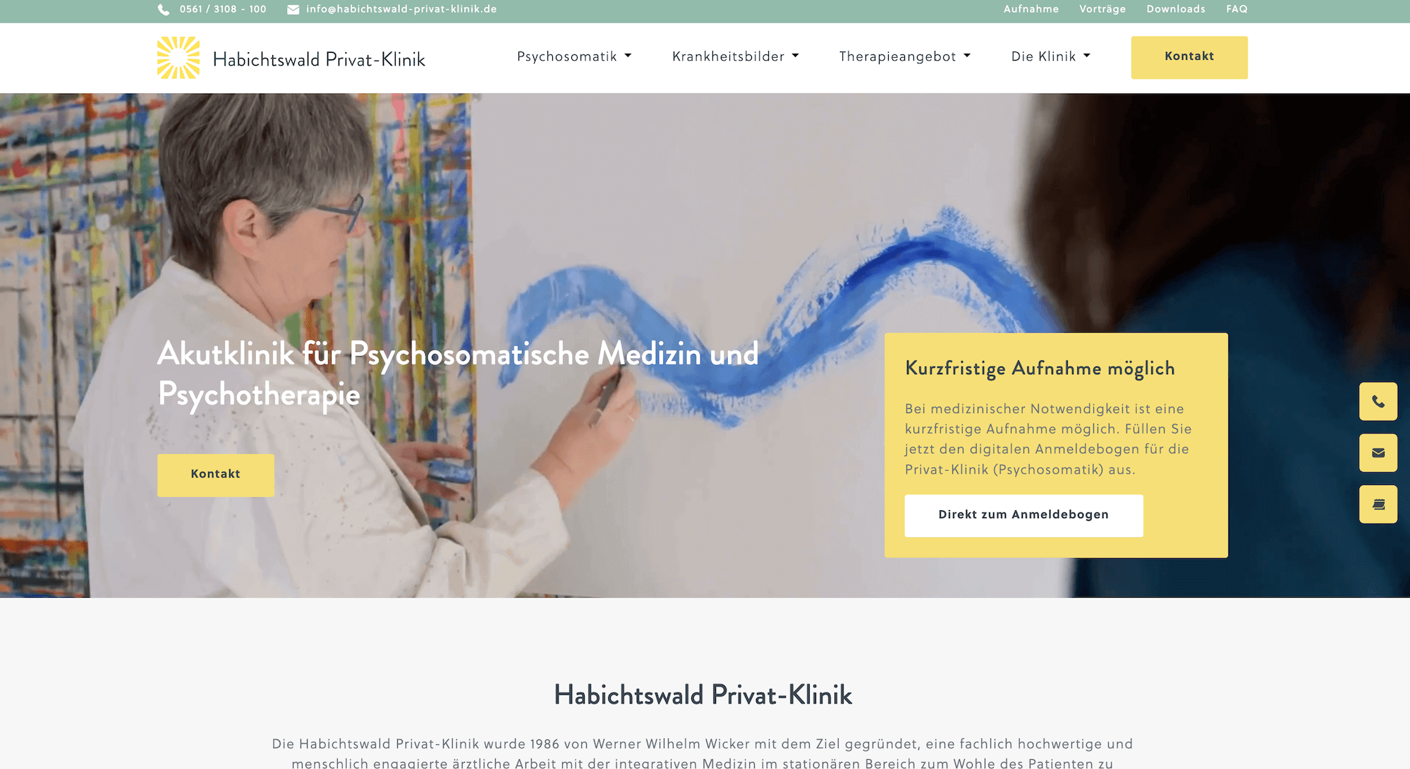 Mitten im Grünen, am UNESCO-Bergpark Wilhelmshöhe in Kassel, steht die Habichtswald Privat-Klinik für spezialisierte Psychosomatik auf höchstem Niveau. Genau diesen Anspruch sollte auch der digitale Auftritt widerspiegeln: Vertrauen, fachliche Kompetenz und eine Atmosphäre, die Sicherheit und Ruhe vermittelt. Dafür haben wir die Präsenz ganzheitlich neu gedacht – von der strategisch aufgebauten Website über suchmaschinenoptimierte Inhalte bis hin zu einer aktiven Social-Media-Kommunikation. Hochwertige Bilder und professionelle Videoaufnahmen unterstreichen die Qualität.