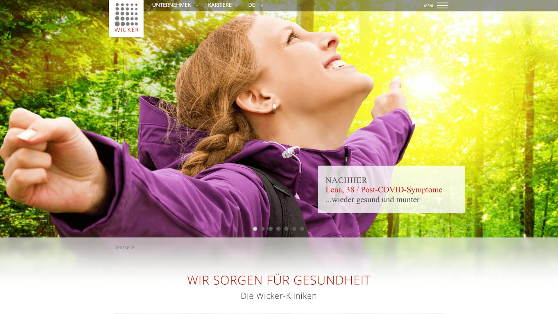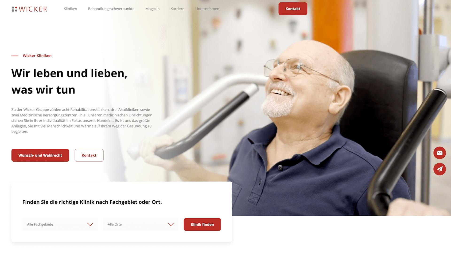 Der Weg zur passenden Klinik sollte für Patienten so einfach wie möglich sein. Zum Zeitpunkt des Relaunches umfasste die Wicker Gruppe neun Rehabilitationskliniken, drei Akutkliniken und zwei Medizinische Versorgungszentren, mit jeweils unterschiedlichen Fachgebieten und Spezialisierungen.