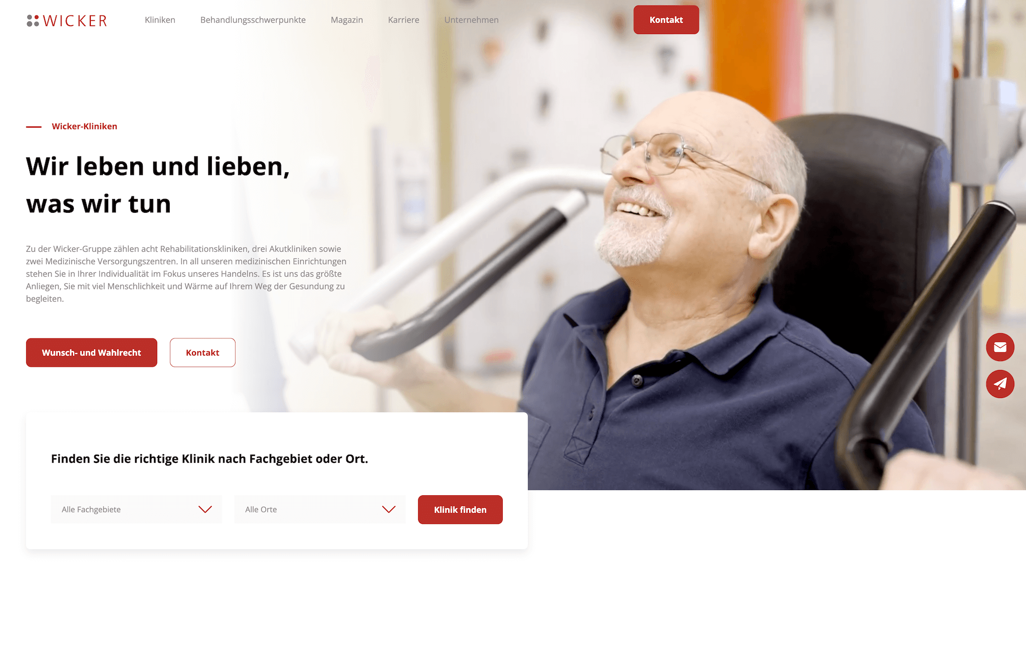 Als wir 2023 die Zusammenarbeit mit der Wicker Gruppe begannen, stand ein umfassender Website-Relaunch im Mittelpunkt. Zwar gab es bereits eine bestehende Website, doch diese war weder technisch noch visuell zeitgemäß. Das war der Start unseres bislang größten technischen Projekts. Die Herausforderung: Eine ganzheitliche Website zu entwickeln, die den vielfältigen Anforderungen der einzelnen Kliniken gerecht wird und gleichzeitig alle Standorte auf einer zentralen Website vereint.