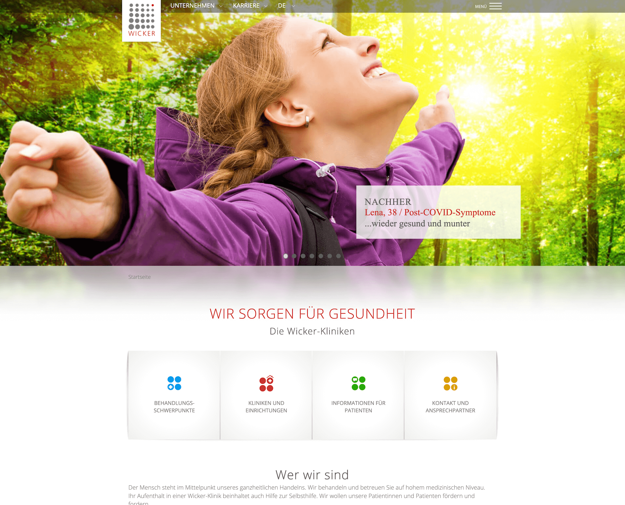 Der Weg zur passenden Klinik sollte für Patienten so einfach wie möglich sein. Zum Zeitpunkt des Relaunches umfasste die Wicker Gruppe neun Rehabilitationskliniken, drei Akutkliniken und zwei Medizinische Versorgungszentren, mit jeweils unterschiedlichen Fachgebieten und Spezialisierungen.